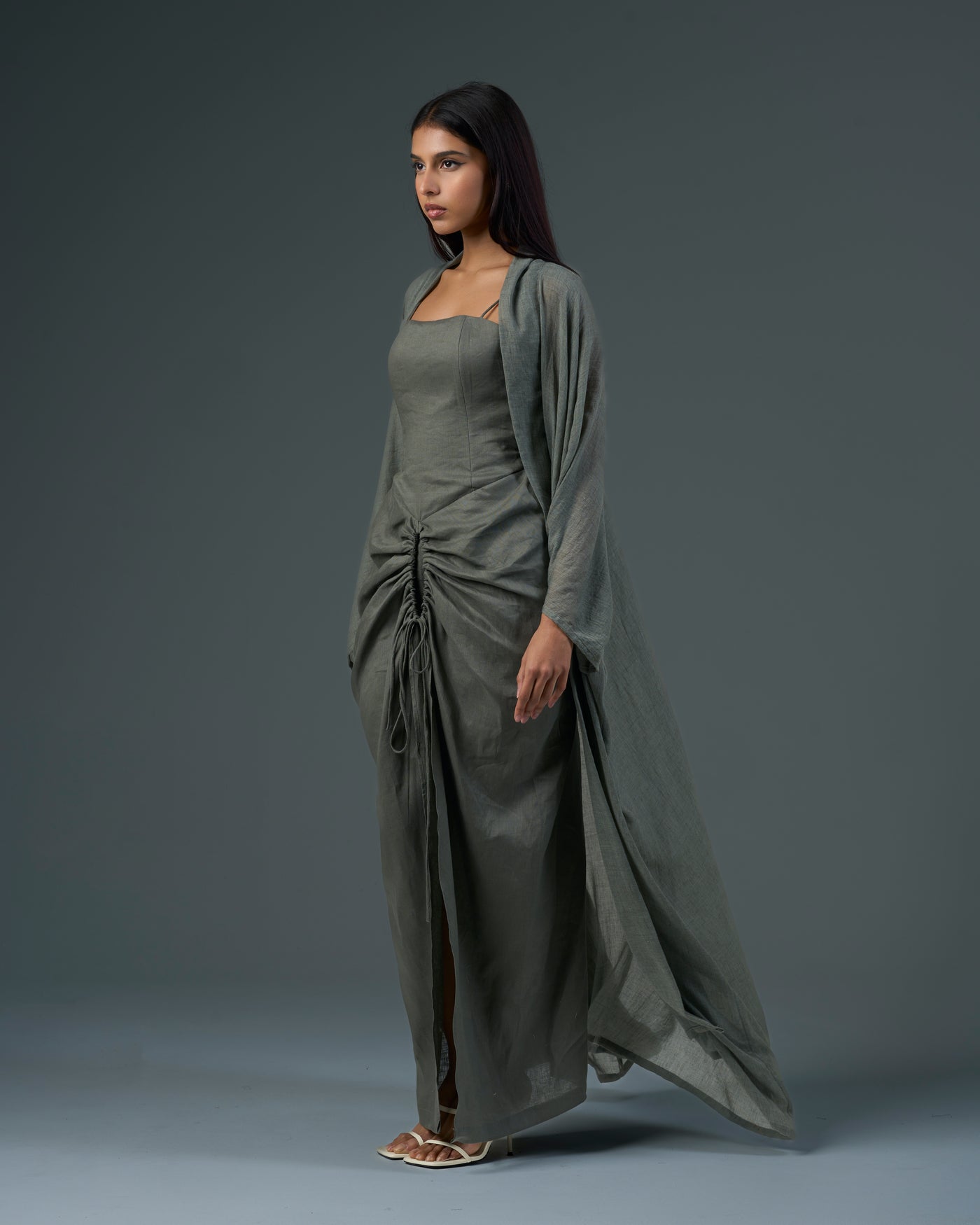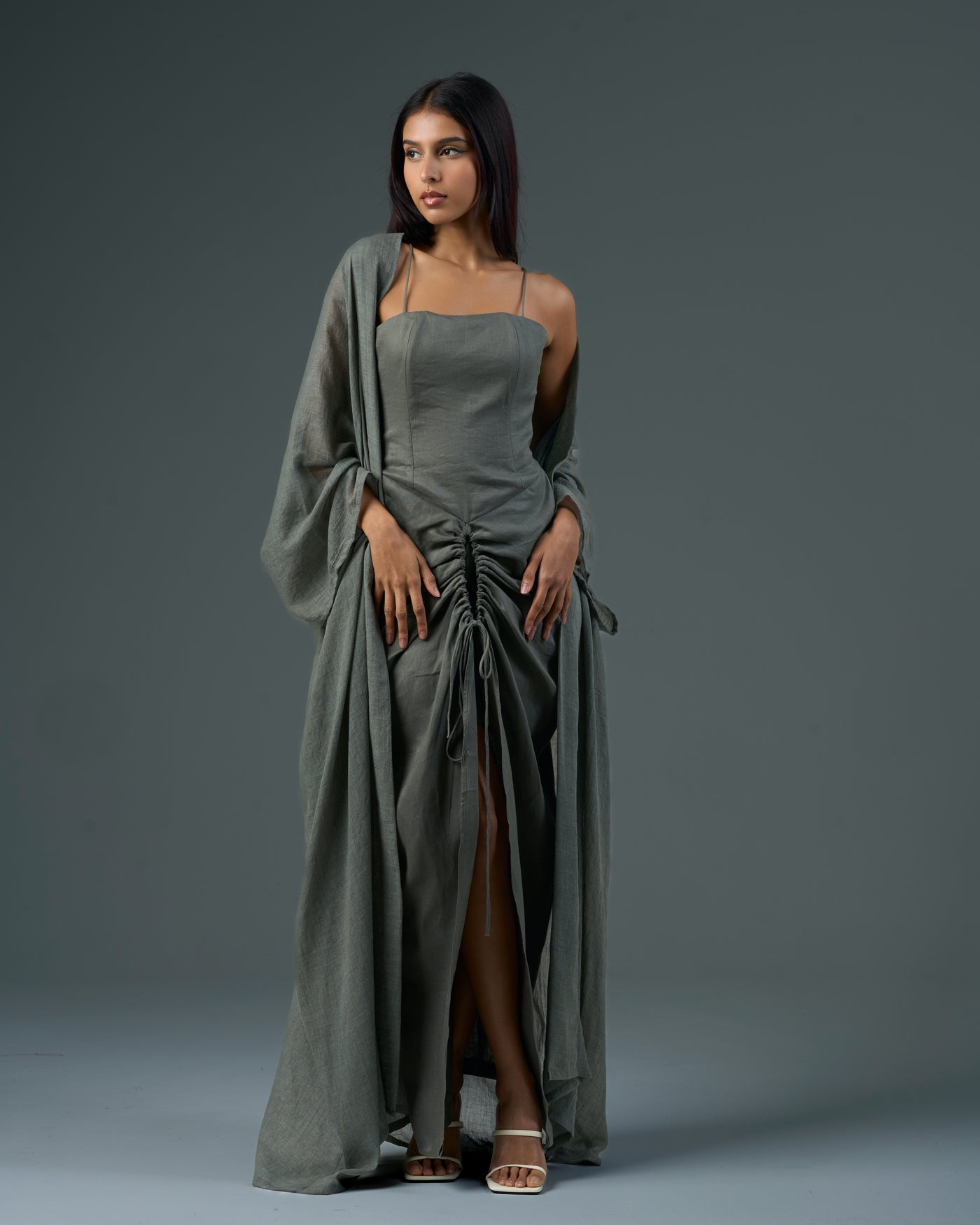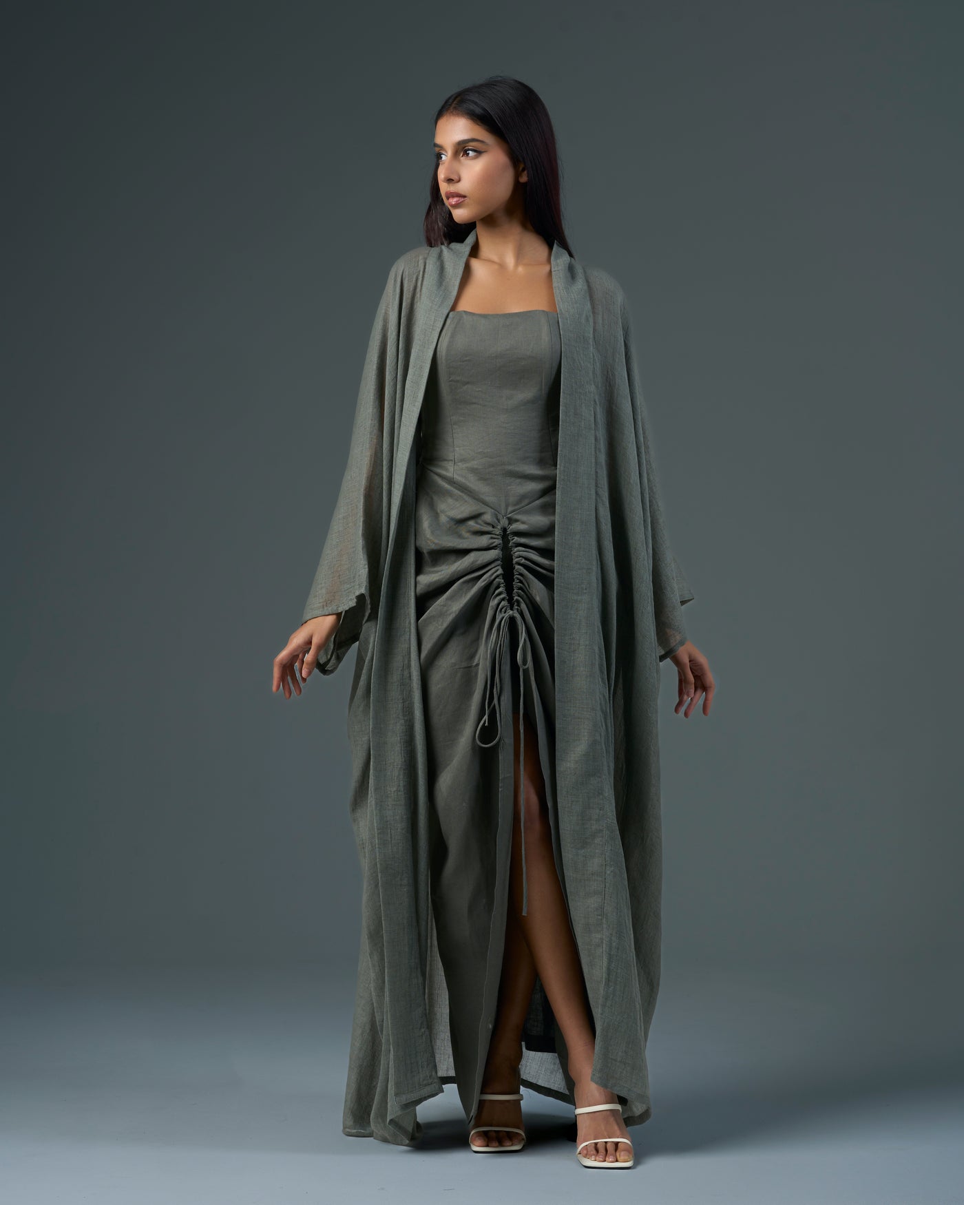 -Wide bisht- dress with corset and open front slit- mini skirt underneath ( length adjustable)- length 55 inches- Models are wearing size XSOrder takes: 10 days for Kuwait 15 days for GCC